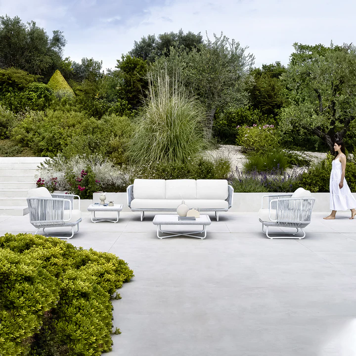 The Astor Outdoor Sofa Set combines elegance and durability with a braided rope design in grey and off-white. Includes a 3-seater sofa, two single seaters, and a center table—perfect for any garden or balcony.