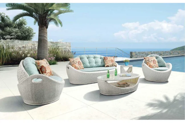 The Crocetta Outdoor Sofa Set in elegant off-white includes a 3-seater sofa, two single seaters, and a center table—perfect for a stylish and comfortable outdoor retreat.