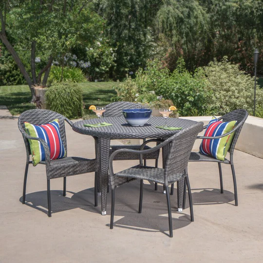 Enhance your outdoor dining experience with the Gelli Outdoor Garden Patio Dining Set, a 5-piece set designed for both elegance and durability. This set features 4 ergonomically crafted chairs and a spacious dining table, all finished in a sleek gray color that complements any patio, garden, or backyard setting. Made from high-quality, weather-resistant materials, it ensures long-lasting use, easy maintenance, and stability. Whether hosting family meals, social gatherings, or casual outdoor dining, this set provides a perfect balance of comfort, style, and functionality. Ideal for year-round enjoyment!