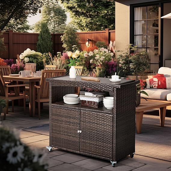 AECOJOY Patio Wicker Bar Tables with Wheels&Shelf Patio Serving Table Outdoor Storage Cabinet Outdoor Bar Cart