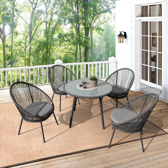 The Votion Outdoor Patio Seating Set in sleek grey includes four stylish chairs and a matching table—perfect for a modern and comfortable outdoor setup.